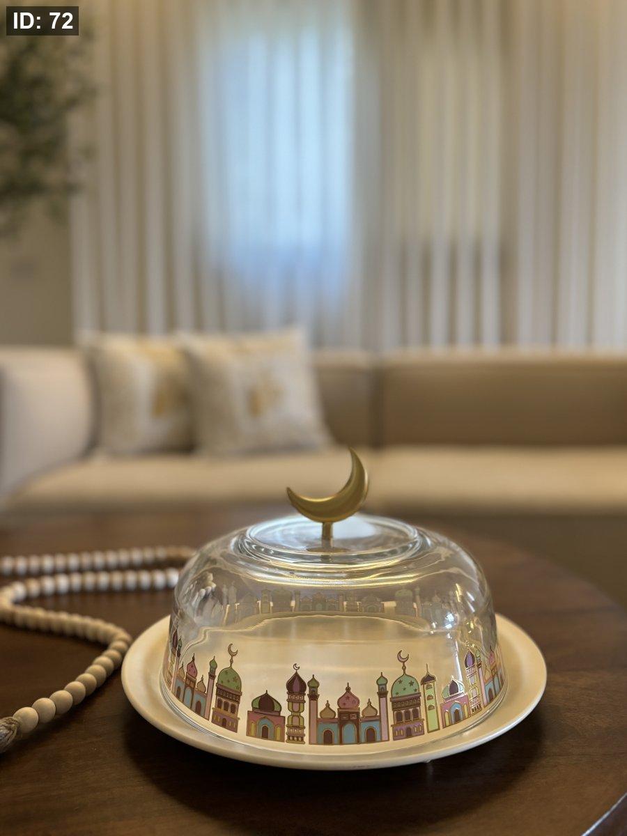 مضيفة مميزه مع غطاء زجاجي برسومات رمضانيه ملونه على الغطاء