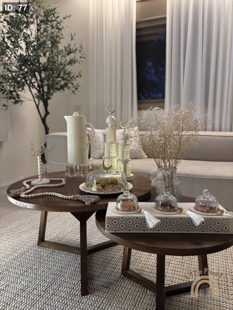 مجموعة مميزه مكونه من 9 قطع من تيرموس مع ستاند اكريلك قطعتين ومضيفة زجاجيه مع غطاء للقطايف ومضيفة ثلاثيه للمجففات ومآذن مضيئه وستاند شرفتونا ومسبحه